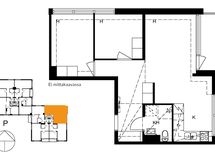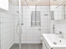 Keittiön jatkeeksi mahtuu ruokailutila. Kylpyhuoneessa on valkoiset Kide-malliston kotimaiset kalusteet. Seinät ovat valkoista laattaa ja lattia on harmaa. Pyykinpesukoneelle löytyy oma paikka.
