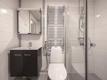 Kauniisti laatoitetussa kylpyhuoneessa on allaskaappi, peilikaappi, kääntyvät suihkuseinät ja liitäntä pyykinpesukoneelle.