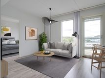 5. kerroksen pikkukoti, jossa mm. keittiö-olohuonetila, erillään sijaitsevat makuuhuoneet sekä lasitettu parveke. Kylpyhuoneessa on tilavaraus pesukoneelle. Kodin kruunaa lasitettu parveke. Näkymät pohjoiseen ja itään.