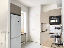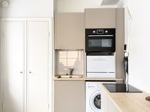 Keittiö yhdistyy mutkattomasti oleskelutilaan ja pinnat on remontoitu pari vuotta sitten. Kaikki tarvittavat varustelut löytyvät kuten astianpesukone. Myös pyykinpesukone jää asuntoon vuokralaisen käyttöön. Säilytystilaa löytyy myös hyvin.