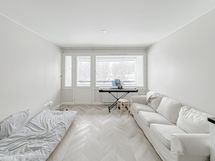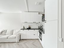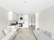 Asunnon isot ikkunat ja vaaleat pinnat tekevät siitä todella valoisan tuntuisen. Avokeittiö on moderni ja varusteluun kuuluu mm. integroitu astianpesukone ja -jääkaappi pakastinlokerolla. Eteisen peilikaapit tarjoavat reilusti säilytystilaa. Kylpyhuone on kokonaan laatoitettu ja siellä on paikka pesukoneelle.