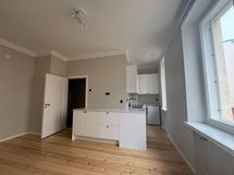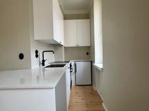 - Jääkaappi(pakastelokerolla), kiertoilmauuni, liesitaso, liestituuletin, paikka pyykinpesukoneelle, kaapistot, kivipuristetasot