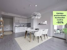 Kahden ensimmäisen kuukauden vuokrat -50%. Etu edellyttää 12kk sitoutumista asumiseen.