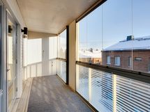 Tyylikäs avokeittiö olohuoneen yhteydessä on varusteltu moderneilla kodinkoneilla. Asuinmukavuutta lisää mukavan kokoinen lasitettu parveke.