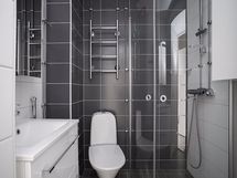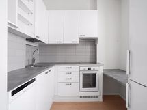 Keittotilassa on valkoiset kaapinovet ja runsaasti työtasotilaa harmaalla korkeapainelaminaatilla. Varustukseen kuuluvat keraaminen liesi, kalusteuuni, jääpakastinkaappi ja astianpesukone. Kylpyhuone on kauniisti laatoitettu modernein sävyin ja tilavaraus löytyy pienelle pesukoneelle.