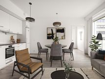 Tässä valoisassa kulma-asunnossa on kauniit skandinaavisen vaaleat sisustusmateriaalit ja laadukkaat keittiölaitteet. Avoin keittiö ja olohuone muodostavat avaran oleskelutilan. Eteisessä on hyvin säilytystilaa ja reilunkokoisesta kylpyhuoneesta löytyy pesukoneelle varaus. Kokonaisuuden kruunaa lasitettu parveke sisäpihan suuntaan!