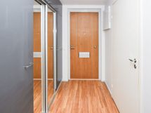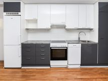 Asuinhuoneiden lattiat ovat tammilaminaattia. Kylpyhuoneessa on mukavuuslattialämmitys, pehmeän harmaa laattalattia ja seinistä kolme kaakeloitu valkoisella ja yksi tyylikkään grafiitinharmaalla isolla kaakelilla. Eteisen kaapistossa on isot peiliovet. Keittokomerossa kiiltävänharmaa alakaapisto täydentyy tummanharmaalla laminaattityötasolla, valkoisella kalustevälikaakeloinnilla ja kiiltävänvalkoisilla yläkaapeilla. Jää-pakastinkaappi, keraaminen liesi ja astianpesukone ovat valkoisia.