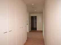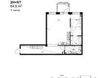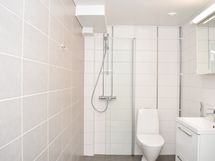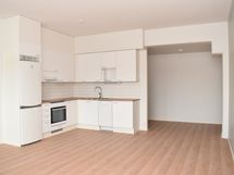 The building has six floors with apartments located on floors 5-6. The apartments have light wood laminate flooring and one of the walls is a grey effect wall. The bathrooms are tiled with white and grey tiles. The bathroom floors have comfort heating connected to the apartment's electricity. The kitchen is equipped with a dishwasher, induction stove and a fridge-freezer. The windows have blinds, and the balconies are glazed.