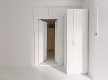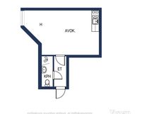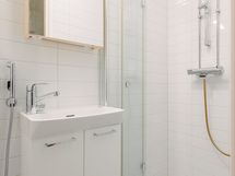 - Pesutilojen kuvaus: Kylpyhuoneessa wc-istuin, peili- ja allaskaappi, suihkuseinä ja pyyhekuivain.