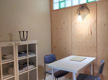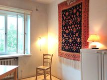 - Asunnossa on toimiva minimikalustus joten vapaata tilaa on paljon. Omia kalusteita mahtuu reilusti. Kalusteet ovat keveitä ja niitä on helppo siirrellä, tarvittaessa pöydät ja vuoteet myös varastoon. Molemmissa huoneissa on 1 hengen sohva tai vuode, televisio, vaatekaappi, pöytä, tuoleja. Vuoteet voi myös siirtää samaan huoneeseen, yhdistää parisängyksi, kulmasohvaksi tai viedä ullakolle. Kadun puoleinen huone on toiminut olohuoneena ja pihan puoleinen ruokasalina tai makuuhuoneena. Muuntelukelpoinen kalustus, soveltuu myös etätyöskentelyyn. Kaappeja mahtuu myös eteisaulaan. Vuokrasopimuksen päättyessä kaikki huonekalut ja muu sisustus sekä tarvikkeet on palautettava paikoillensa.
