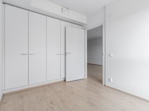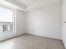 Asunnon seinäpinnat ovat valkoiset ja lattiassa on vaalea laminaatti