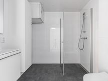 Vaaleansävyisessä kylpyhuoneessa on valkoinen keraaminen seinälaatta ja harmaa keraaminen lattialaatta sekä kääntyvät suihkuseinät. Säilytystilana on allaskaappi sekä peilikaappi. Täysleveälle pyykinpesukoneelle on myös paikka kylpyhuoneessa.