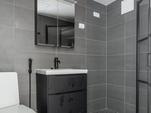Asunto on hyvässä kunnossa ja kuten kuvistakin näkee, kylpyhuone on persoonallisempi eikä ole tyydytty vakiokalusteisiin. Myös pyykinpesukoneelle on oma paikkansa.
