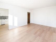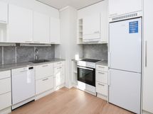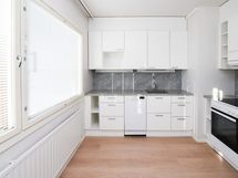 Lattiasta kattoon remontoitu kaksio Ihastu uudenveroiseen pikkukotiin Remontoidun, selkeän ja tilavan kaksion kalustat helposti omaksi kodiksi. Kodin keskipiste on avara olohuone, jonka ilmavuutta lisää koko huoneen levyinen ikkuna. Pintamateriaalit ovat vaaleita ja pelkistetyn yksinkertaisia. Lattiat ovat vaaleaa tammilaminaattia ja seinät on maalattu valkoisiksi. Erillisessä keittiössä on tilaa sekä kokkailla että ruokailla. Linjakkaat kaapistot ovat valkoiset ja niiden pinta mukailee puun kuvioita. Ylä- ja alakaappien välinen tila ja työtaso ovat harmaata laminaattia. Varustukseen kuuluu keraaminen liesi, liesikupu, astianpesukone ja jääkaappipakastin. Kodinkoneet ovat valkoisia. Kylpyhuoneessa on valkoiset SATOn Kide-malliston kalusteet. Seinät ovat valkoista laattaa ja lattia on harmaa. Pesukoneelle on varaus.