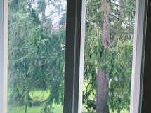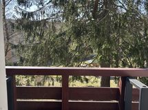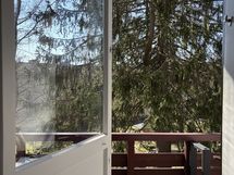 Makuuhuone 1: Kaksi sinkkusänkyä, joita voi yhdistää parisängyksi jos halajaa. Ikkunasta näkyy iso kuusi. Sohvalta näkyy iso kuusi ja seisten esteetön näkymä leikkipuistoon jossa avogrillialue.