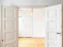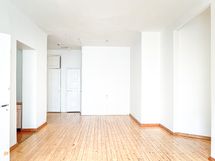 Tässä kodissa on avara pohjaratkaisu ja siistit vaaleat seinät ja lankku lattia tuo vanhaa tunnelmaa. Makuuhuone on ihanan valoisa ja ikkunasta näet rauhalliselle sisäpihalle. Keittiö on kompakti mutta olohuoneen puolella neliöitä onkin sitten senkin edestä, joten sinne saat helposti sohvan lisäksi mahtumaan, vaikka ruokapöydän.