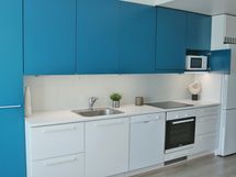 Both bedrooms offer ample closet space and blackout curtains. Between the bedrooms, there is a generously sized bathroom with glossy white tiled walls and petrol blue floor tiles. A washing machine, cleaning supplies, and a shower make daily life convenient. The lower cabinets and drawers in the open kitchen are white, while the upper cabinet doors are petrol blue. The compact kitchen is equipped with an oven, ceramic stove, fridge-freezer, dishwasher, and microwave. All necessary cooking utensils and dishware are included as standard.