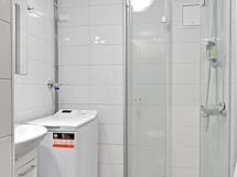 - Allas, allaskaappi, wc-istuin, suihku/kääntyvät suihkuseinät, pesukoneliitäntä, kiinteät valaisimet. Lattia: Laatta. Seinät: Laatta