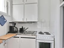 - Ikkunallinen keittokomero: sähköliesi, jenkkikaappi. Alkuperäiset valkoiset keittiökaapistot, laminaattityötaso. Lattia: Muovi. Seinät: Maalattu