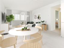 Rentoa vuokra-asumista kotoisassa ympäristössä Viihdy täysin päivitetyssä, toimivapohjaisessa kodissa Kaksiossa on tehokas pohja: tilava olohuone-keittiö ja juuri sopivankokoinen makuuhuone. Kesällä tila jatkuu omalle, lasitetulle eteläparvekkeelle. Kodissa on mukavasti säilytystilaa sekä eteisessä että makuuhuoneessa. Kodikkaassa asunnossa on ikkunoita kahteen eri suuntaan: näkymät olohuoneesta ja makuuhuoneesta avautuvat etelään ja keittiön ikkunat ovat itään päin. Täysin uusitussa kylpyhuoneessa on kaikki tarpeellinen ja tilavaraus pyykkikoneellesi.