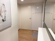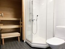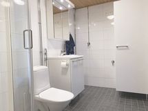 Suihkukaappi, lattialämmitys, peilikaappi, pesukoneliitäntä, laattaseinä, laattalattia