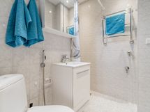 - Suihku, peilikaappi, allaskaapisto, pesukoneliitäntä, pyyhekuivain ja lattialämmitys. Lattia: Laatta. Seinät: Laatta