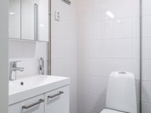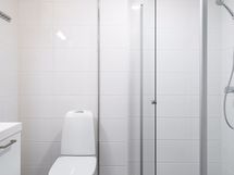 Eteisestä löytyvät komerot vaatesäilytykselle ja sieltä on kulku kodin kylpyhuoneeseen. Kylpyhuoneen lattiassa on harmaa laatoitus ja seinissä on valkoinen laatoitus. Purkit ja purnukat löytävät paikkansa peilikaapista sekä allaskalusteesta ja oma pyykinpesukoneesi mahtuu kylpyhuoneeseen hienosti. Talosta löytyy myös maksuton pesutupa, joten omaa pyykinpesukonetta ei välttämättä tarvitse hankkia.