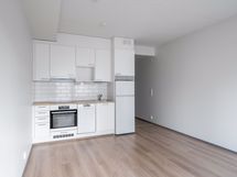 Hillitty värimaailma antaa sinulle tilaa leikitellä erilaisilla sisustustyyleillä ja väreillä. Lattiassa on tammensävyinen laminaatti ja seinät ovat valkoisella maalatut. Keittotilan kaapistot ovat valkoiset, välitilassa valkoinen laatoitus ja työtaso on lämpimän puun sävyinen laminaattitaso. Keittotilan varusteisiin kuuluvat: jenkkimallinen jääkaappi pakastinlokerolla, astianpesukone, kalusteuuni, keittotaso sekä liesikupu.