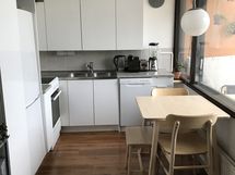 Paljon kaappitilaa, Suuri tiskipöytä, Astianpesukone, Induktioliesi, Jää-pakastinkaappi, Laminaattitasot