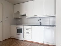 Keittiö on kaunis ja käytännöllinen, varustettu vaaleilla kaapistoilla, harmaalla työtasolla ja vaalealla välitilan laatalla. Astianpesukone tuo arkeen helppoutta. Kylpyhuoneessa on tumma lattialaatta, valkoiset seinät, suihkuseinä ja paikka pyykinpesukoneelle. Tämä koti sopii erinomaisesti sinulle, joka arvostat toimivuutta, selkeää pohjaratkaisua ja lasitetun parvekkeen tuomaa lisämukavuutta.