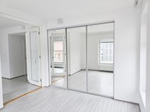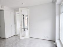 Erityismaininnan ansaitsee tilava makuuhuone, jossa koko seinän levyinen peilikaapisto lisää sekä valoisuutta että avaruutta ja tarjoaa samalla runsaasti käytännöllistä säilytystilaa. Tyylikkäät kaksoisovet makuuhuoneeseen viimeistelevät kokonaisuuden tuoden lisää tilantuntua ja avointa ilmettä.