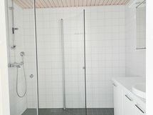 Laatoitetussa kylpyhuoneessa on harmaa lattia ja valkoiset seinät, ja tilasta löytyvät myös pyykinpesukoneliitännät sekä suihkuseinä, jotka tekevät arjesta sujuvaa ja tilasta helppohoitoisen.