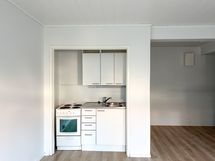 Tyylikäs laminaattilattia ja kompakti keittiö tekevät asumisesta vaivatonta. Kokonaan laatoitetussa kylpyhuoneessa ei ole paikkaa pyykinpesukoneelle, mutta taloyhtiön ilmainen pesutupa helpottaa arkea.