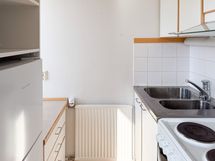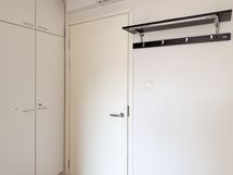 Asunnossa on kätevä alkovi, joka luonnollinen paikka sängylle ja tekee kokonaisuudesta toimivan. Eteisessä on hieman kaappitilaa arjen säilytystarpeisiin. Keittokomero on kompakti, mutta käytännöllinen. Kylpyhuone on laatoitettu valkoisella ja vihertävällä laatalla ja siellä on paikka kapealle pyykinpesukoneelle.