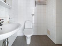 Kylpyhuone on laatoitettu harmaalla lattialla ja valkoisilla seinillä ja varustettu pyykinpesukoneliitännällä.