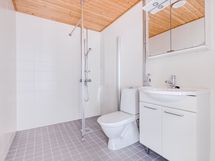 Keittiössä on vaaleat kaapistot, tyylikäs harmaa työtaso, keraaminen liesi ja astianpesukone. Kylpyhuone on laatoitettu ajattoman tyylikkäästi harmaalla lattialla ja valkoisilla seinillä. Kokonaisuus on toimiva ja moderni, juuri sellainen koti, jossa arki rullaa vaivattomasti.