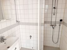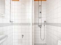 Kompakti kylpyhuone on laatoitettu vaalein sävyin ja sieltä löytyy liitännät pyykinpesukoneelle (huomioithan, että tilaan ei mahdu 60 cm leveä kone).
