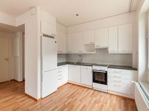 Keittiö on kaunis ja käytännöllinen, varustettu vaaleilla kaapistoilla, harmaalla työtasolla ja vaalealla välitilan laatalla. Astianpesukone tuo arkeen helppoutta. Kylpyhuoneessa on tumma lattialaatta, valkoiset seinät, suihkuseinä ja paikka pyykinpesukoneelle. Tämä koti sopii erinomaisesti sinulle, joka arvostat toimivuutta, selkeää pohjaratkaisua ja lasitetun parvekkeen tuomaa lisämukavuutta.