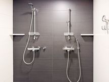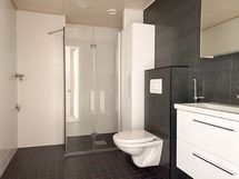 Kylpyhuone hurmaa tumman harmaan ja valkoisen sävyillä, ja integroidun wc-istuimen sekä lasisten suihkuovien ansiosta kokonaisuus on erityisen moderni ja elegantti.