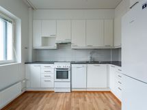 Keittiö on kaunis ja käytännöllinen, varustettu vaaleilla kaapistoilla, harmaalla työtasolla ja vaalealla välitilan laatalla. Astianpesukone tuo arkeen helppoutta. Kylpyhuoneessa on tumma lattialaatta, valkoiset seinät, suihkuseinä ja paikka pyykinpesukoneelle. Tämä koti sopii erinomaisesti sinulle, joka arvostat toimivuutta, selkeää pohjaratkaisua ja lasitetun parvekkeen tuomaa lisämukavuutta.
