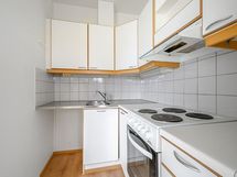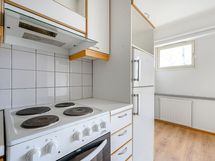 Lattioissa on laminaatti ja keittiö sijaitsee omassa tilassaan. Keittiössä on valkoinen kaapisto puureunuksin, valkoinen työtaso ja valkoinen välitilanlaatta, jotka tuovat raikkaan ja ajattoman ilmeen.