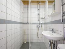 Eteisessä on pieni vaatehuone ja eteisestä kulku kylpyhuoneeseen. Kompakti kylpyhuone on laatoitettu harmaalla ja valkoisella sävymaailmalla. Pyykinpesukoneelle on liitännät, mutta taloyhtiön maksuton pesutupa tarjoaa vaihtoehtoisen ja tilaa säästävän ratkaisun.