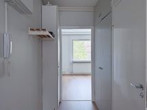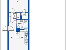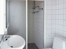 Kaksiossa on käytännöllinen pohjaratkaisu, jossa tilat jakautuvat selkeästi ja tuntuvat neliöitään suuremmilta. Kylpyhuone on laatoitettu valkoisella ja sinertävillä sävyillä, tuoden tilaan raikkaan tunnelman.
