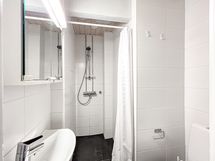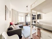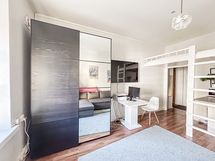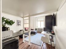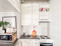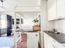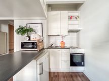 Asunnon neliöt ovat tehokkaassa käytössä ja parvi tuo lisää tilaa asumiseen. Käytännöllinen avokeittiö, jossa on kiinteä pöytätaso jota voi käyttää myös ruokapöytänä. Kylpyhuone on kompakti, mutta suihkutila on kuitenkin oma erillinen nurkkauksensa. Pyykinpesu onnistuu taloyhtiön pesutuvassa. Asunnon ikkunat ovat sivukadulle, Helsinginkujalle päin.
