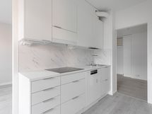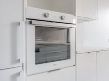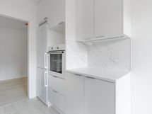 Keittiö on selkeälinjainen ja ajattoman tyylikäs: vaaleat kaapinovet, valkoinen työtaso sekä marmoria jäljittelevä välitila luovat raikkaan ja yhtenäisen ilmeen. Modernit kodinkoneet ja astianpesukone tekevät arjesta vaivatonta, ja toimiva tila kutsuu viihtymään myös ruoanlaiton parissa.
