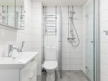 Kylpyhuoneessa vaaleanharmaat ja valkoiset laatat luovat rauhallisen ja raikkaan kokonaisuuden. Tila on suunniteltu käytännölliseksi ja helposti ylläpidettäväksi.
