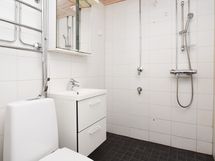 Asuinhuoneissa on helppohoitoiset ja kodin tunnelmaan sopivat tammilaminaattilattiat. Kylpyhuoneen lattiat on laatoitettu harmaalla ja seinät valkoisella kaakelilla. Valkoisissa keittiökaapistoissa on kaunis kiiltävä pinta ja työtasot ovat pehmeänharmaata laminaattia. Varusteina ovat jää-pakastinkaappi ja nelilevyinen sähköliesi.