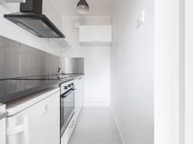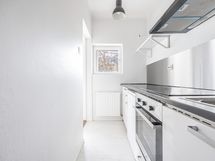 Liesi: integroitu, erillisuuni. Työtasot: laminaatti. Kylmäsäilytys: jääkaappi. Varustus: liesituuletin. Tilava keittiö, jossa hyvin työskentelytilaa.