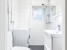 Varustus: pesukone, pesukoneliitäntä, wc-istuin, suihku, peilikaappi.