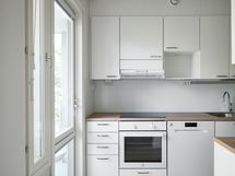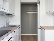 Kodin yleisilme on vaalean skandinaavinen ja sisustusratkaisut raikkaat. Lämminsävyinen laminaattilattia sointuu kauniisti keittiön valkoisiin kaapistoihin ja puunsävyisiin työtasoihin, joita täydentävät harjatut vetimet. Keittiön varustukseen kuuluvat laadukkaat Electroluxin kodinkoneet sekä keittiökomeron jatkeena avautuva pieni lasitettu parveke, jossa on ihana aloittaa päivä vaikkapa aamukahvilla. Tyylikkäässä kylpyhuoneessa on valkoisen ja harmaan laatoituksen lisäksi moderni allaskaappi, peilikaappi, pesukoneliitännät ja kaunis lasiseinä suojaamassa suihkutilaa